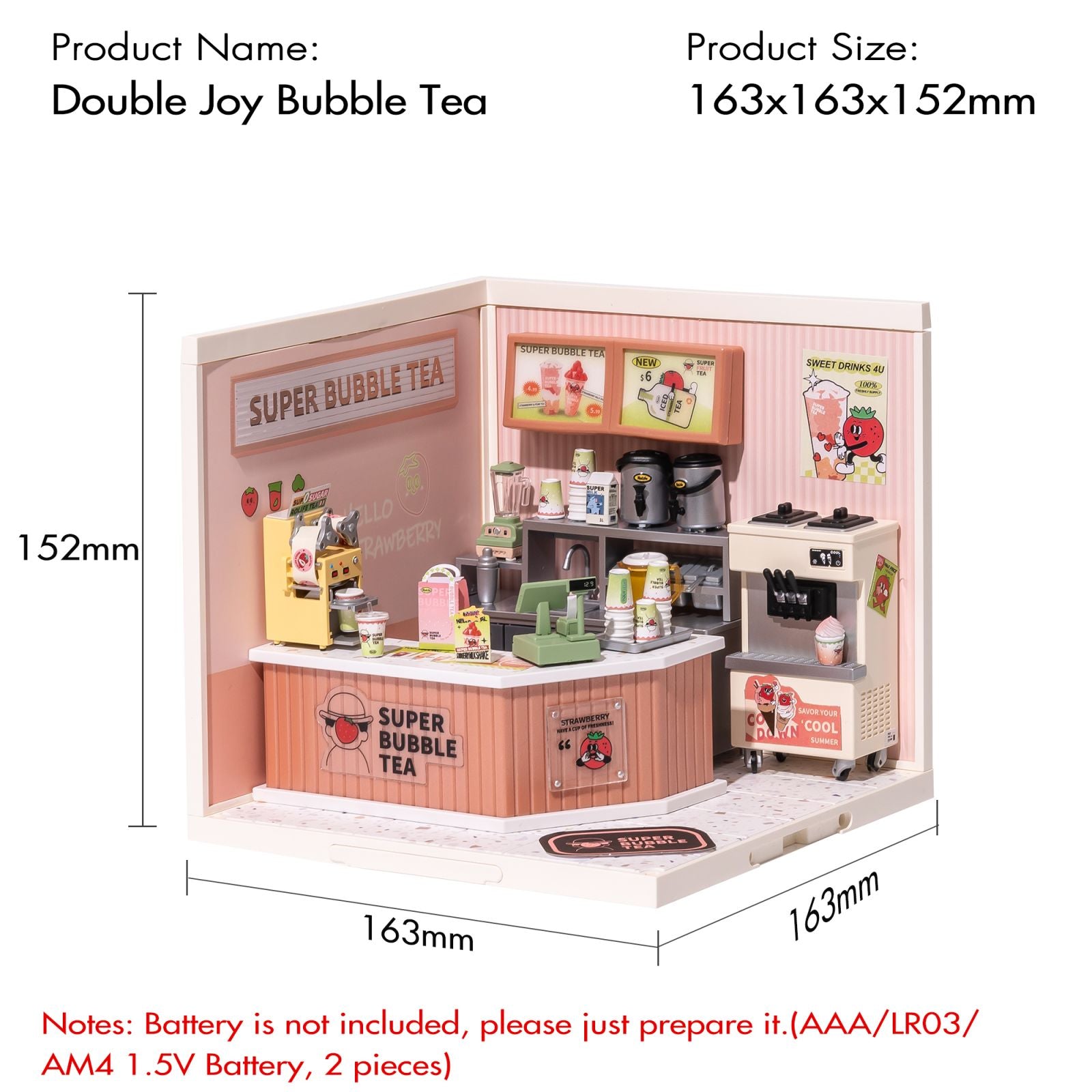 Double Joy Bubble Tea DW006 is a plastic DIY miniature house from Rolife Super Creator - Super Store Series. We believe that people's sorrows and joys may not be connected, but the mood of wanting to drink bubble tea is connected! This top-selling milk tea store offers a wide variety of tasty and healthy bubble tea and soft drinks. Don't miss our strawberry drinks since strawberries are recently in season! Build this miniature bubble tea shop with your own hands and enjoy the happiness it brings to you!